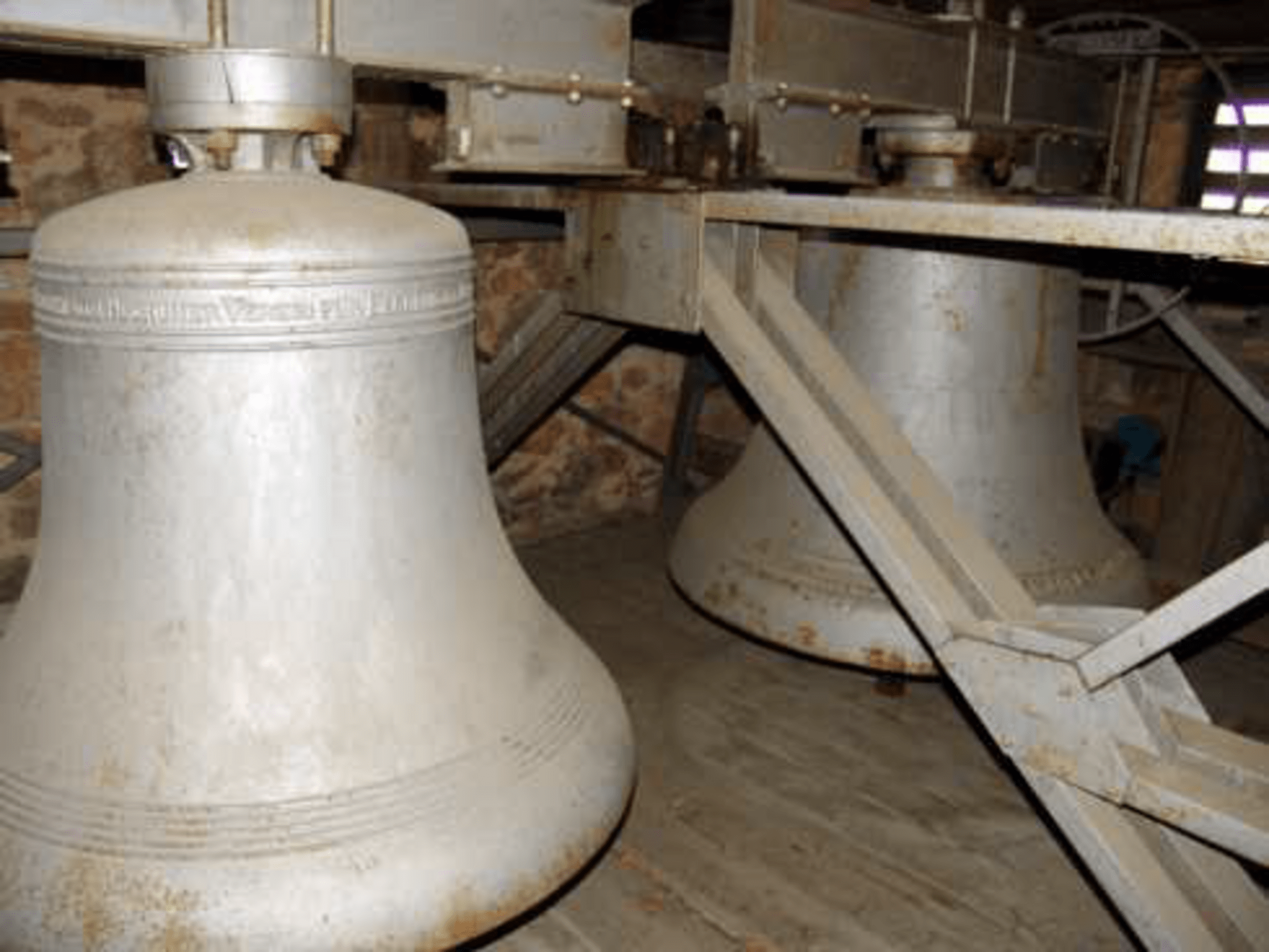 Was wir jetzt sehen: eine Stahlglocke des Bochumer Vereins für Bergbau und Gußstahlfabriken (BVG) mit einem Durchmesser von 111cm, Gewicht 850 kg, Ton g‘, und eine Klanggusglocke aus Eisen der Firma J.F. Weule, Bockenem, mit einem Durchmesser von 126 cm, Gewicht ~825 kg, Ton as, beide aus dem Jahr 1919.