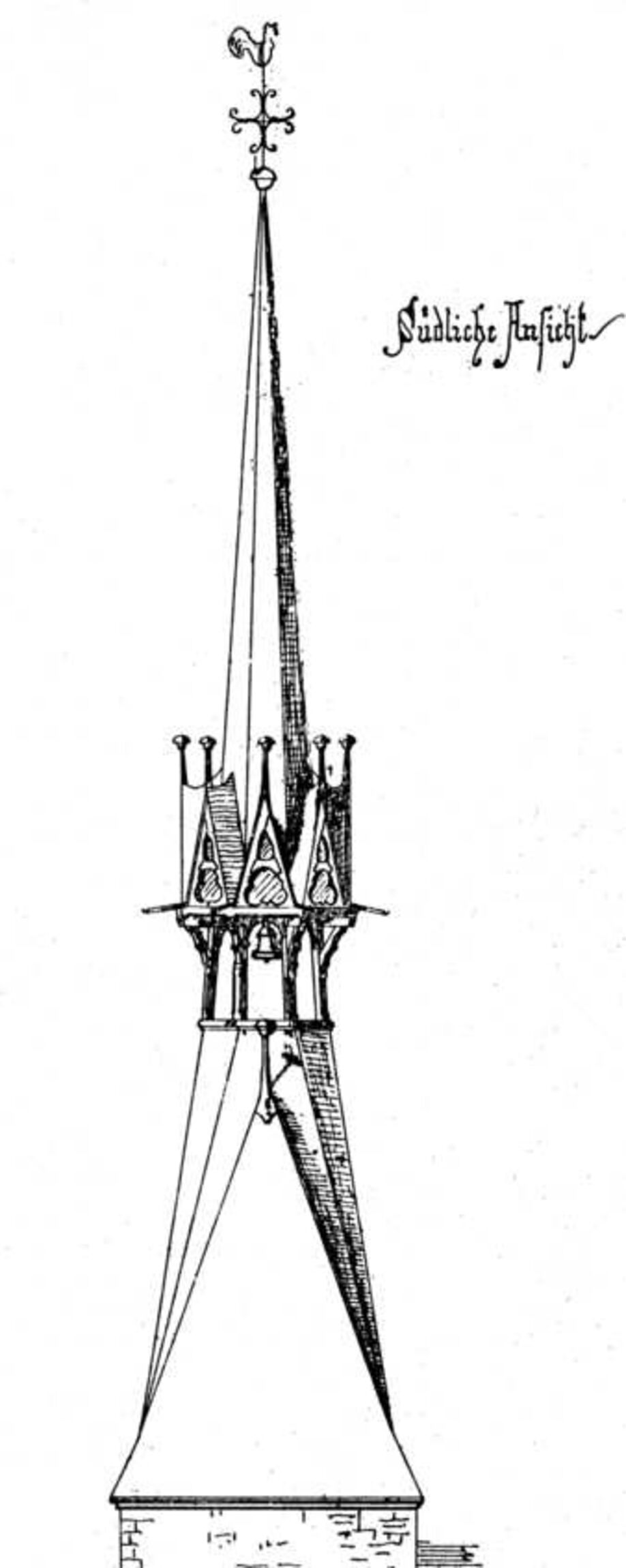 Über zwei hälzerne Stiegen gelangen wir in die Glockenstube, die zwei Ebenen höher liegt als die Turmuhr. Eine imposante, stabile Eisenkonstruktion trägt die beiden Glocken. Leider sind es nicht mehr diejenigen, von denen in der Historia Ecclesiastica aus Sülfeld berichtet wird: