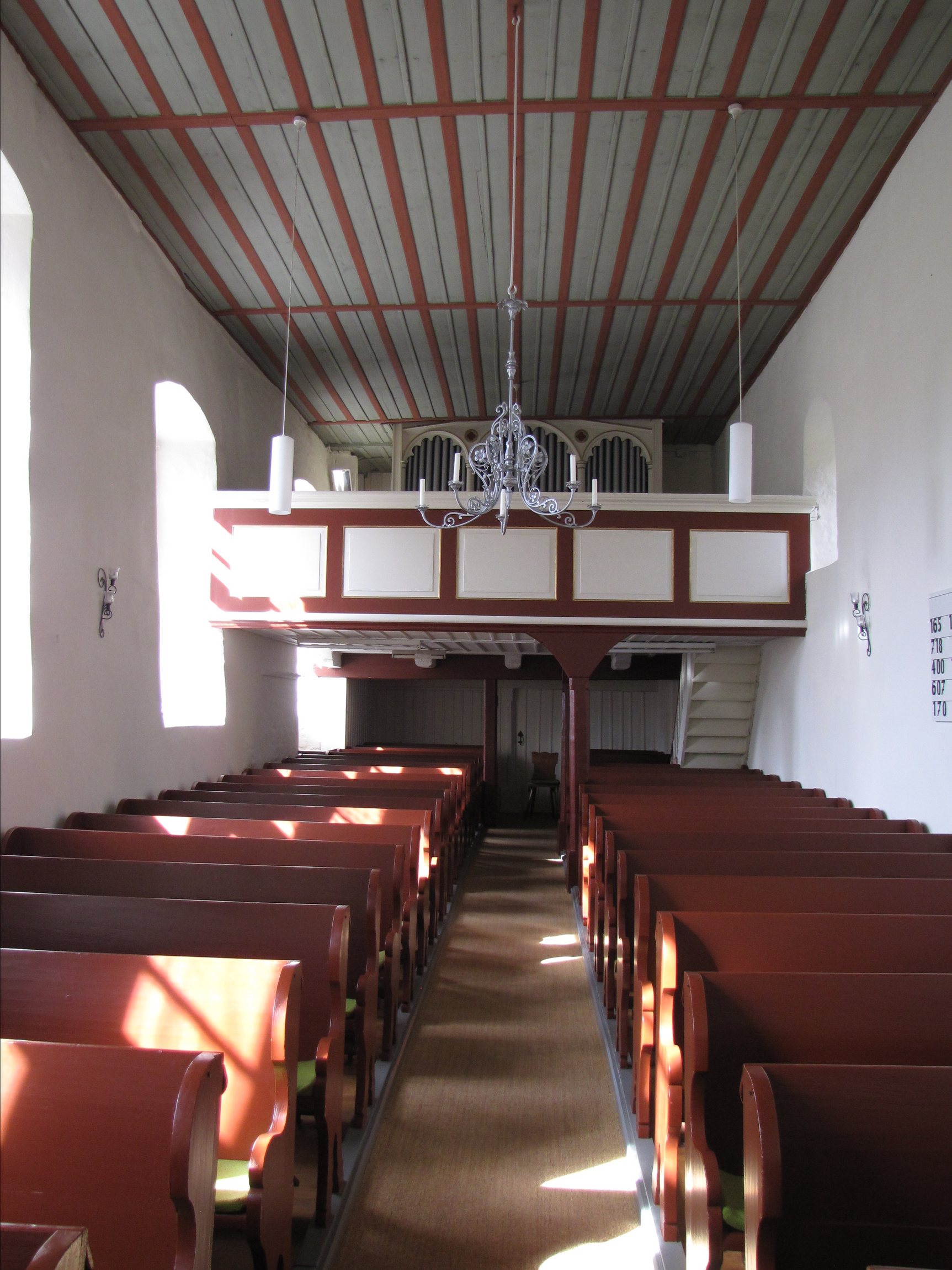 Das Innere der Kirche ist schmucklos. Der östliche Teil macht sich als Chor nur durch eine erhöhte Stufe bemerkbar. Eine spitzbogige Nische in der Nordwand. Gerade Holzdecke, im Westen eine neuere Empore.